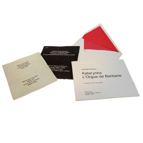 This bilingual edition of Prévert’s L’Orgue de Barbarie was conceived as a book-object rather than a conventional bound volume. The poem’s rondeau-like composition, its circular movement, irony, and recurring logic suggested a form that could be read without end: a joined accordion.