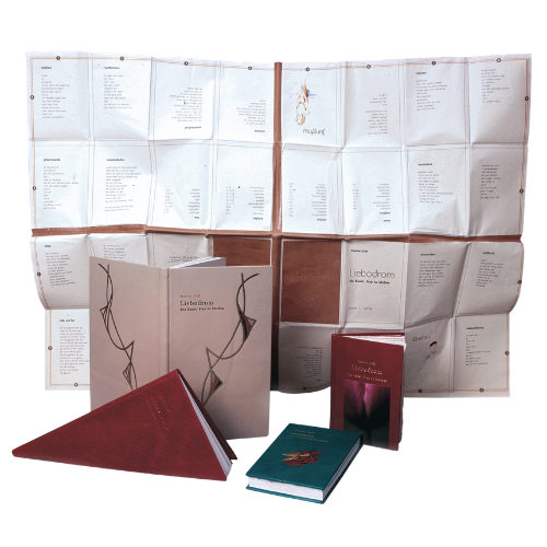Issued in seventeen different structures and shapes, the edition includes triangular books, tear-off notebook forms, and fold-out map-like constructions in which coordinates determine the location of poems. The bindings range from leather and silk to paper, collage, original photographs, and experimental contemporary structures.