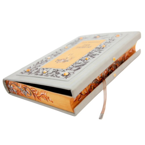 Issued in only thirty-eight numbered copies, with jewellery bindings and leather fine bindings alike, and enriched by hand-applied 23-carat gold tooling on both covers and pages, the book becomes a material act of reverence. It is not merely finely made; it is a volume shaped for works that belong to the highest registers of reading.