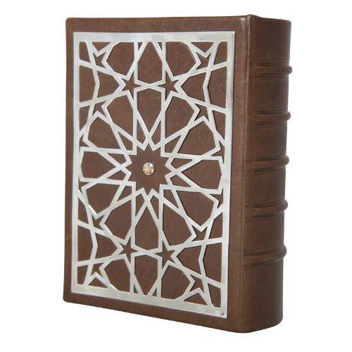The edition was designed in direct relation to Kazakh artistic tradition. Rich silvered borders and characteristic national ornament shape the decorative language of the book, while a restrained silver-grey palette is combined with deep blue or black leather. The result is ceremonial, but disciplined.